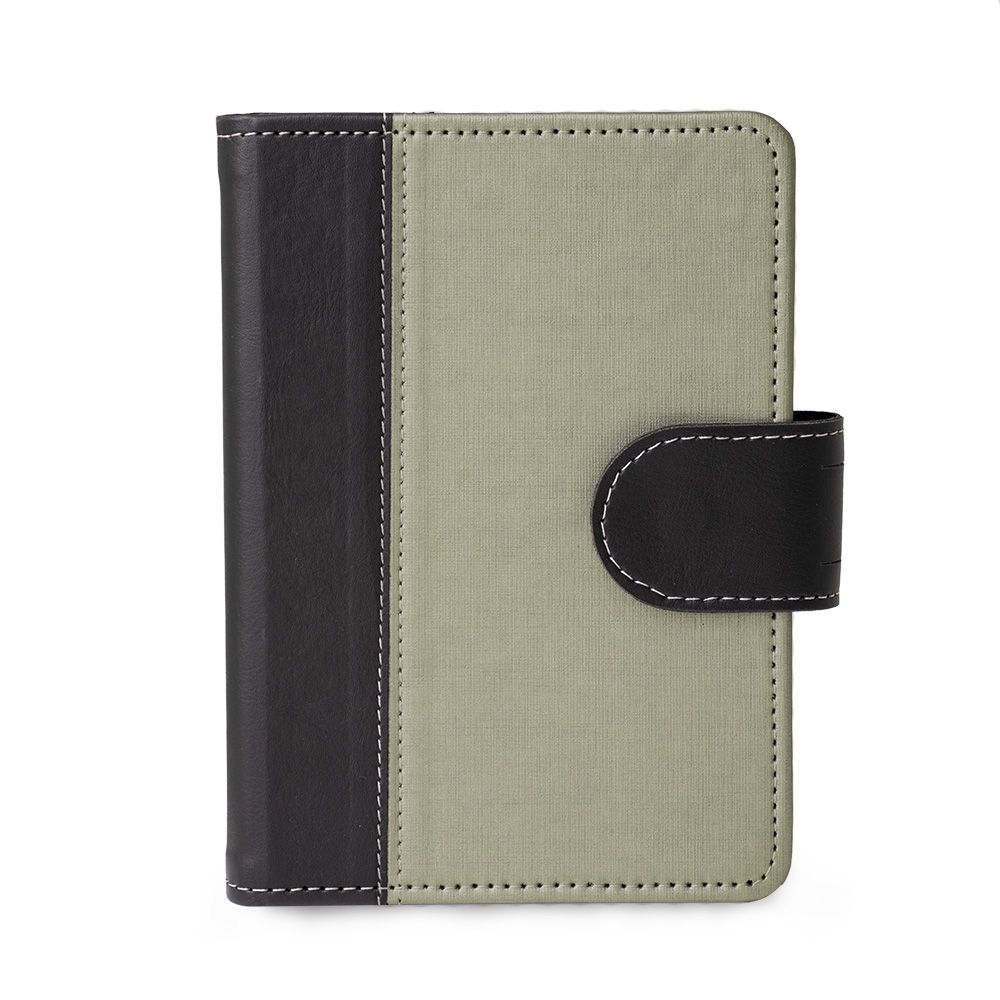 Caderneta de couro sintético com fechamento de botão. Possui caderno capa dura em couro sintético com aproximadamente 100 folhas pautadas, divisórias para cartões e bolso lateral.