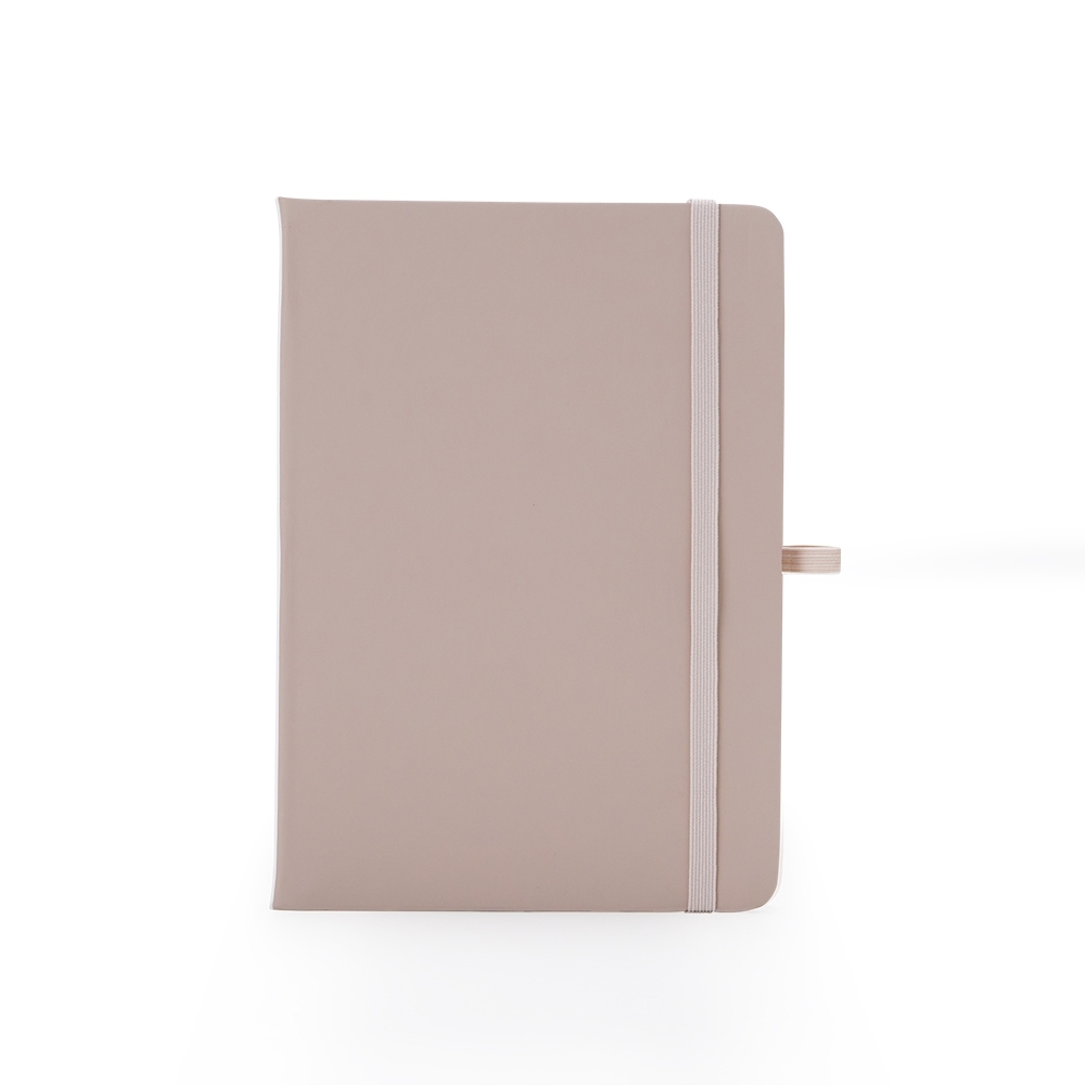 Caderneta emborrachada com suporte para caneta, elástico para lacre e marcador de página em cetim, contém aproximadamente 80 folhas com pauta na cor branca.