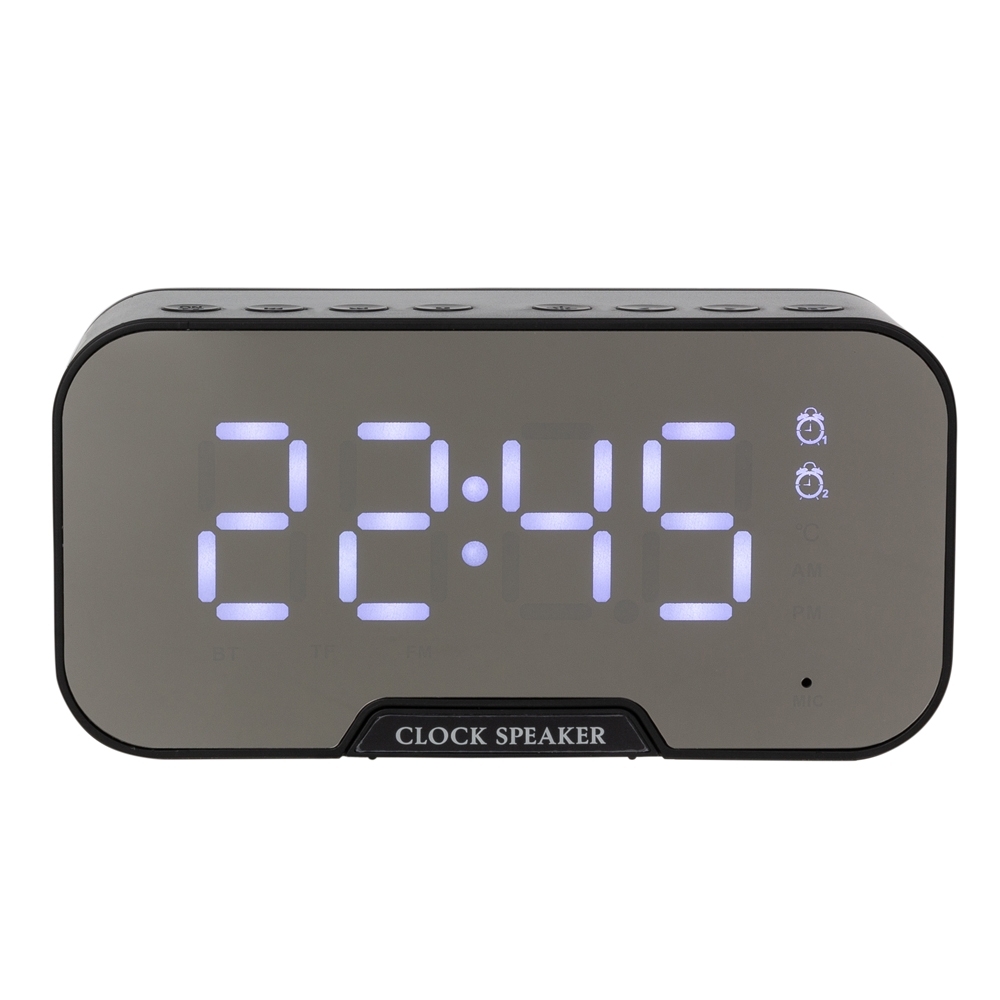 Caixa de som multimídia com relógio despertador e suporte para celular. Produzida em plástico e com borrachas antiderrapantes na área inferior, a caixa de som tem a área frontal espelhada e display de LED, além de um compartimento com suporte para celular ? uma espécie de ?gaveta? aonde é exibido (CLOCK SPEAKER), basta puxá-la ter acesso ao compartimento. A caixa de som executa nos modos bluetooth, rádio FM, cartão TF-microSD (até 16GB) e entrada auxiliar P2. Acompanha cabo USB e manual em inglês.