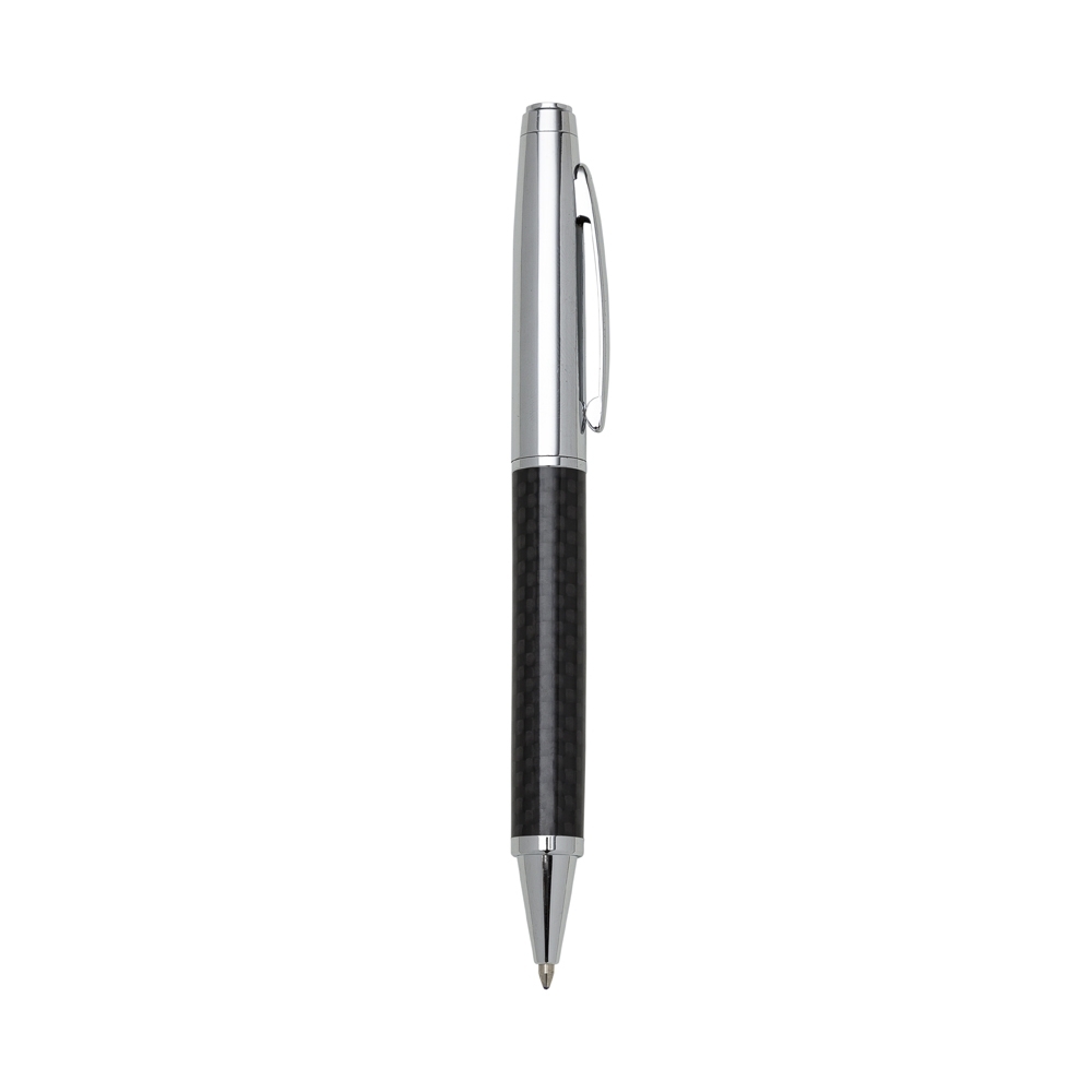 Caneta metálica com acabamento brilhante, versões em couro sintético e fibra preta. Carga esferográfica azul e acionamento por rotação.