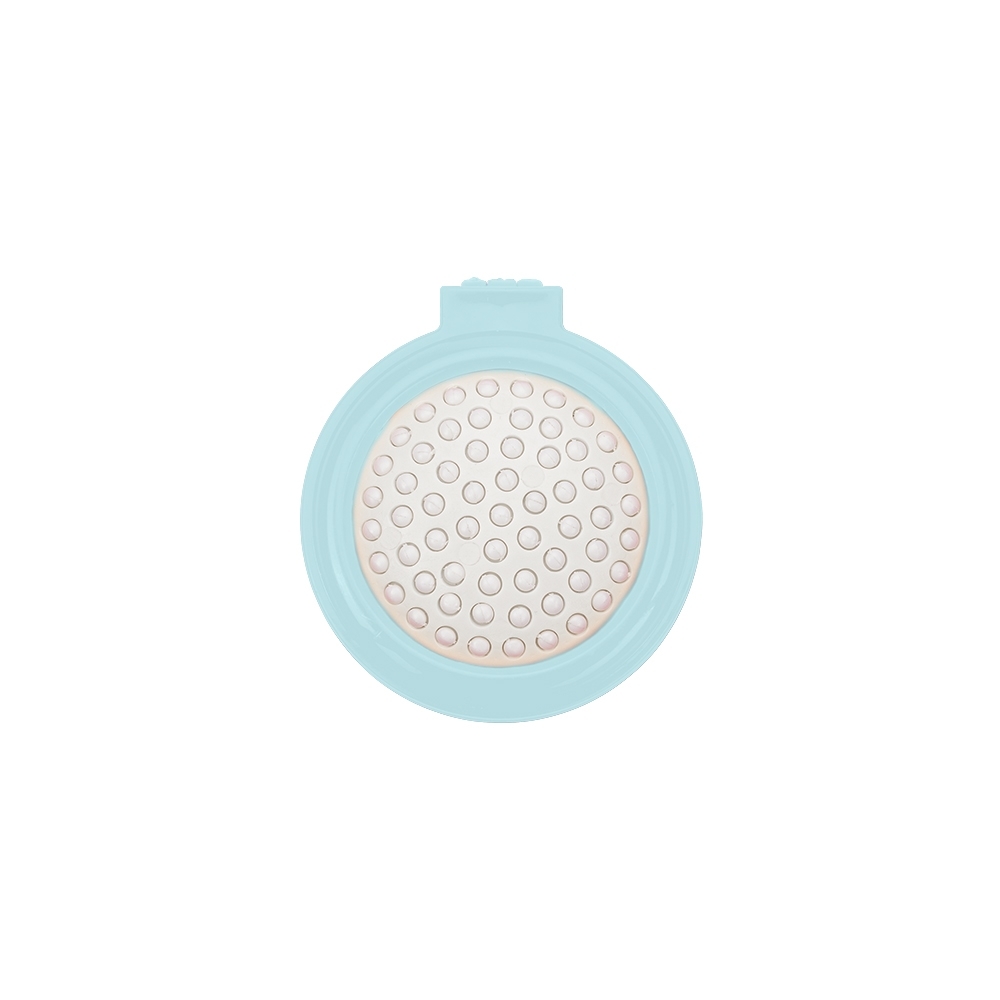 Escova com espelho redonda em plástico resistente. Parte superior plana e parte inferior emborracha com relevo, estando aberta a peça basta empurrar a parte emborrachada(lado de fora) para poder utilizar a escova.