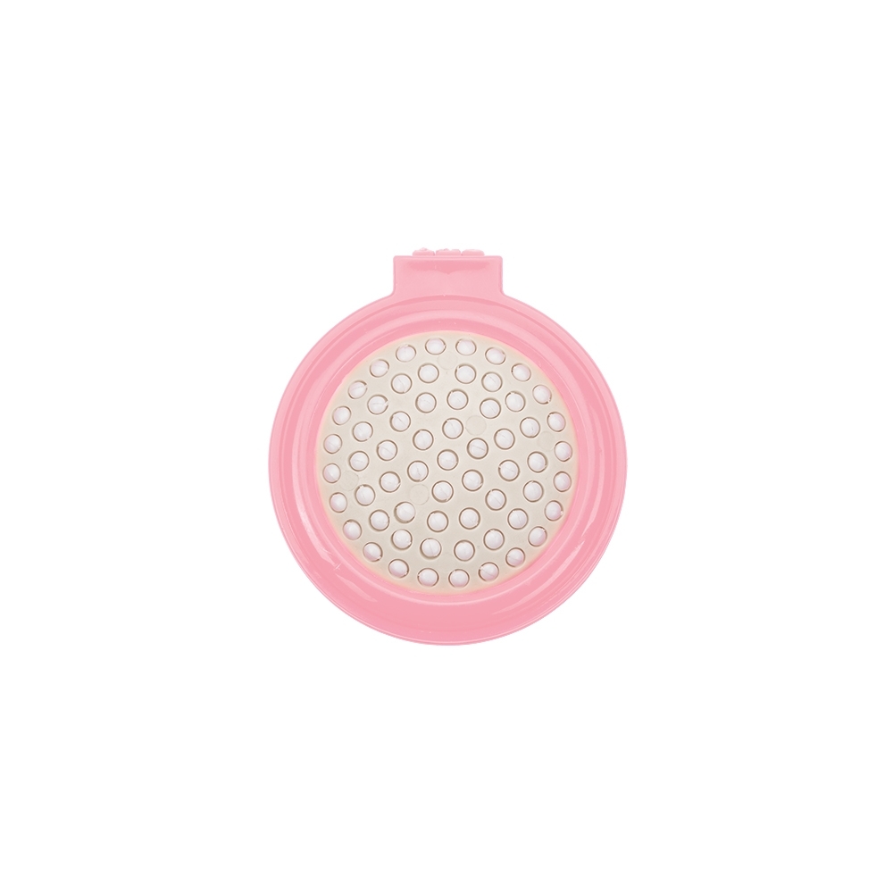 Escova com espelho redonda em plástico resistente. Parte superior plana e parte inferior emborracha com relevo, estando aberta a peça basta empurrar a parte emborrachada(lado de fora) para poder utilizar a escova.