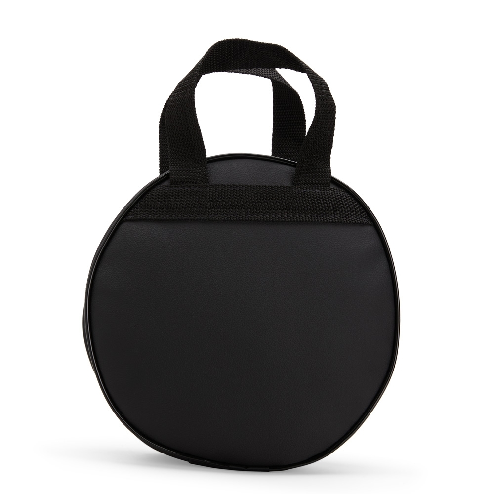 Bolsa porta-pratos em couro sintético e fechamento em zíper. Possui compartimento interno que inclui bolso em tela de nylon, além de duas alças para transporte.