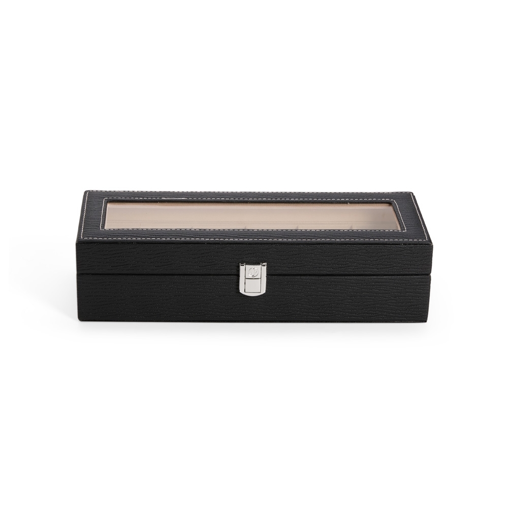 Porta-relógios com acabamento texturizado em couro sintético à base de PVC e revestimento interno em tecido aveludado. Possui seis divisórias com almofadas removíveis, visor de vidro e trava de segurança.