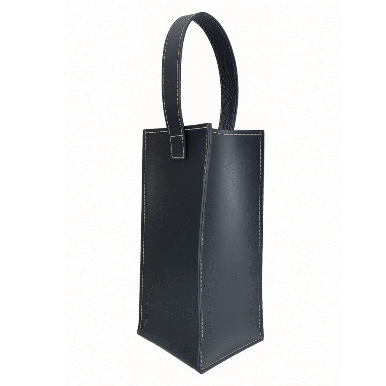 O couro sintético Vegano oferece excelente durabilidade e fácil manutenção. Dessa forma, o acessório mantém a aparência impecável mesmo com o uso frequente. Além disso, as costuras reforçadas valorizam o acabamento e garantem estrutura firme para acomodar a garrafa com segurança.